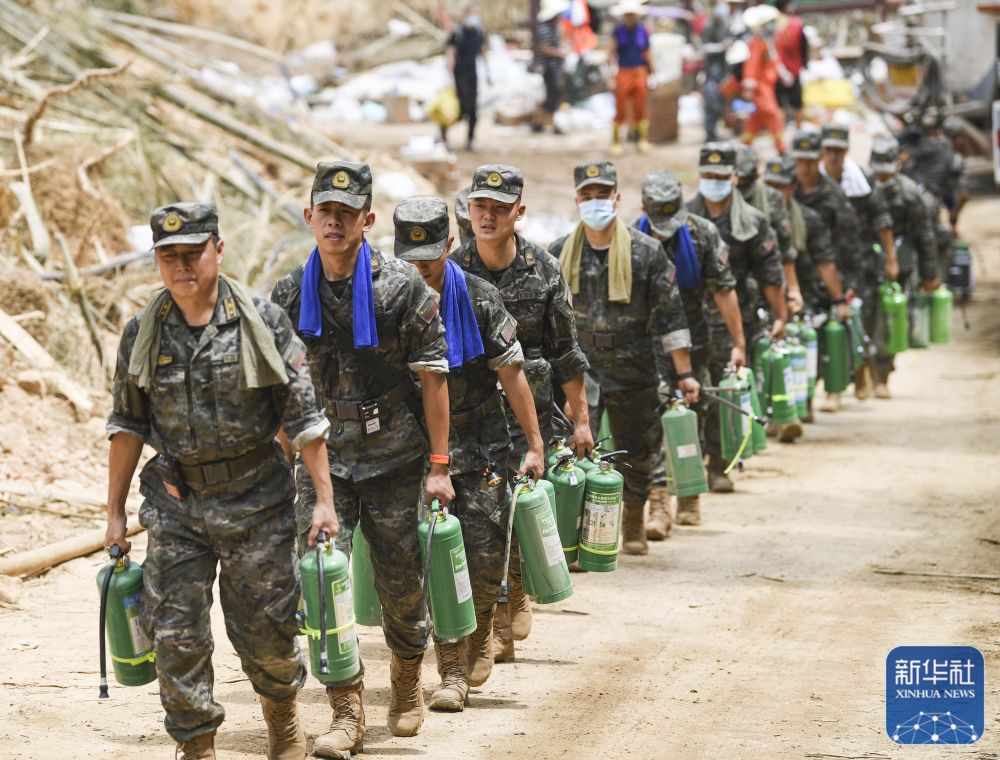 8月26日,在重庆北碚区歇马街道,消防、武警等救援力量和志愿者在运送物资。