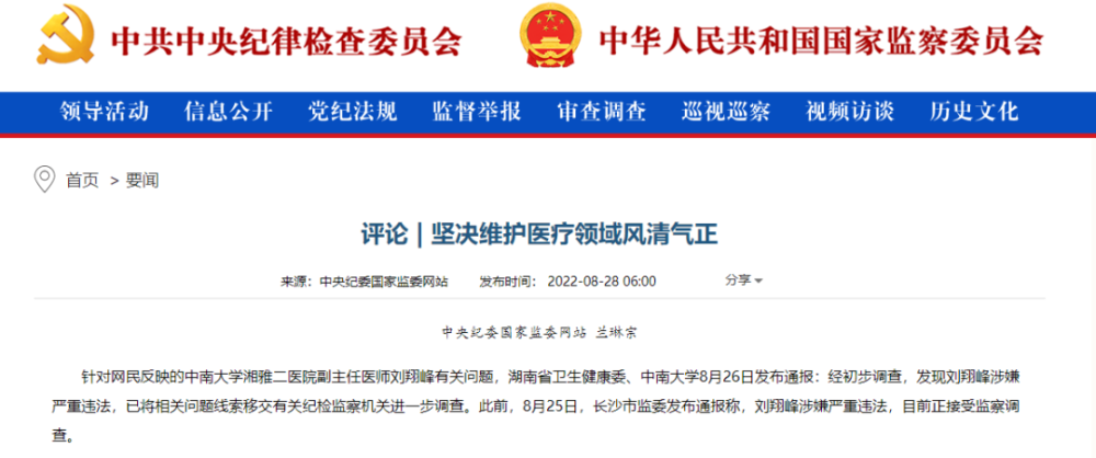 针对网民反映的中南大学湘雅二医院副主任医师刘翔峰有关问题,中央纪委国家监委网站8月28日发布评论文章《坚决维护医疗领域风清气正》。