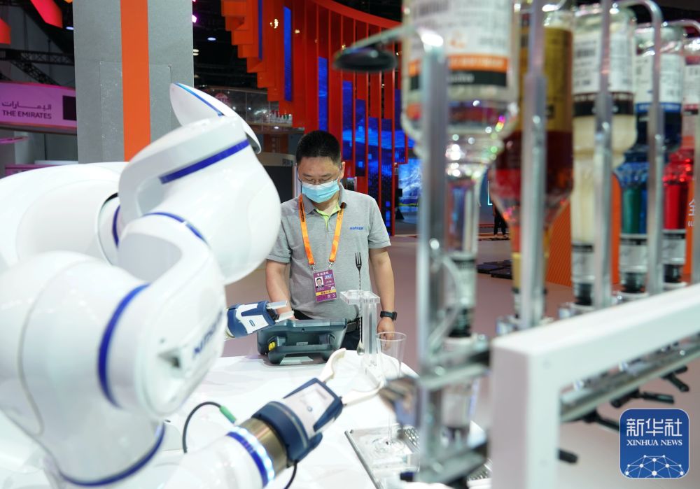8月28日,工作人员在调试一款参展2022年服贸会的双臂协作机器人。