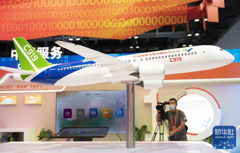 8月28日,在国家会议中心举行的服贸会媒体探营活动中,记者拍摄C919飞机模型。