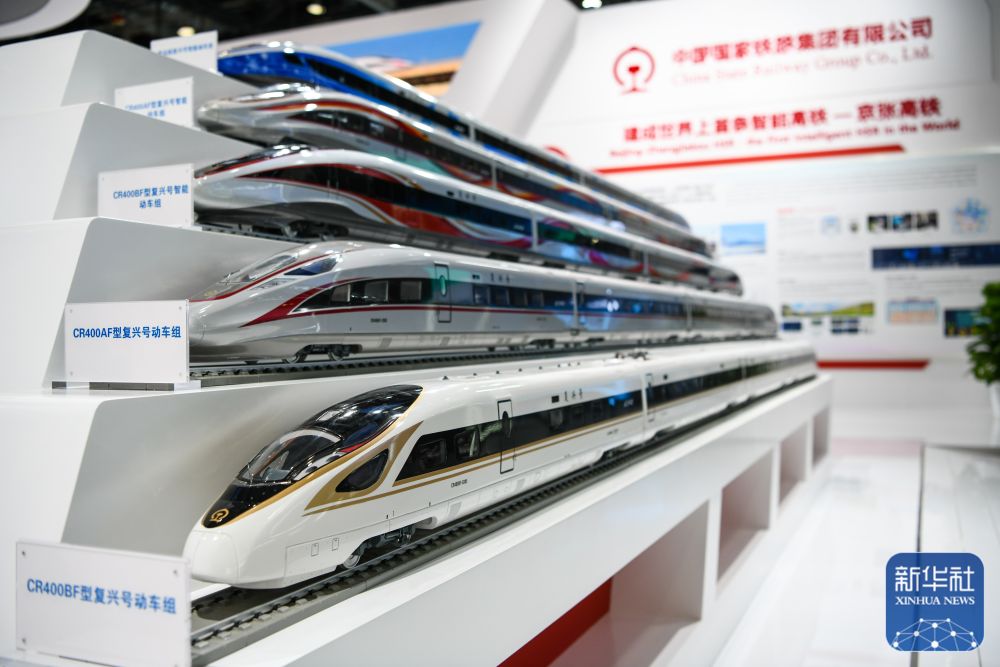 这是8月28日在国家会议中心服贸会媒体探营活动中拍摄的铁路主题展台。