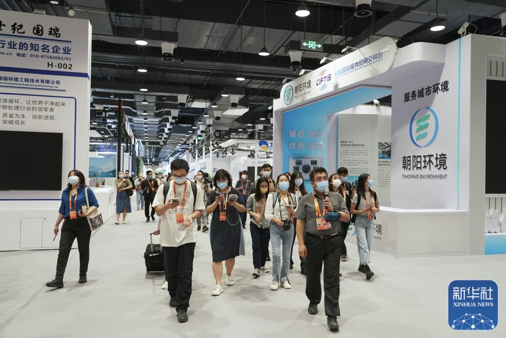 8月28日,在国家会议中心举行的服贸会媒体探营活动中,人们在展区参观。