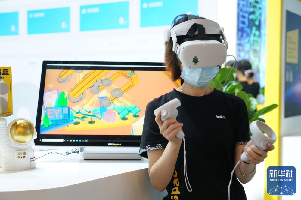 8月28日,在国家会议中心举行的服贸会媒体探营活动中,一名高通公司的工作人员展示工体元宇宙GTVerse。