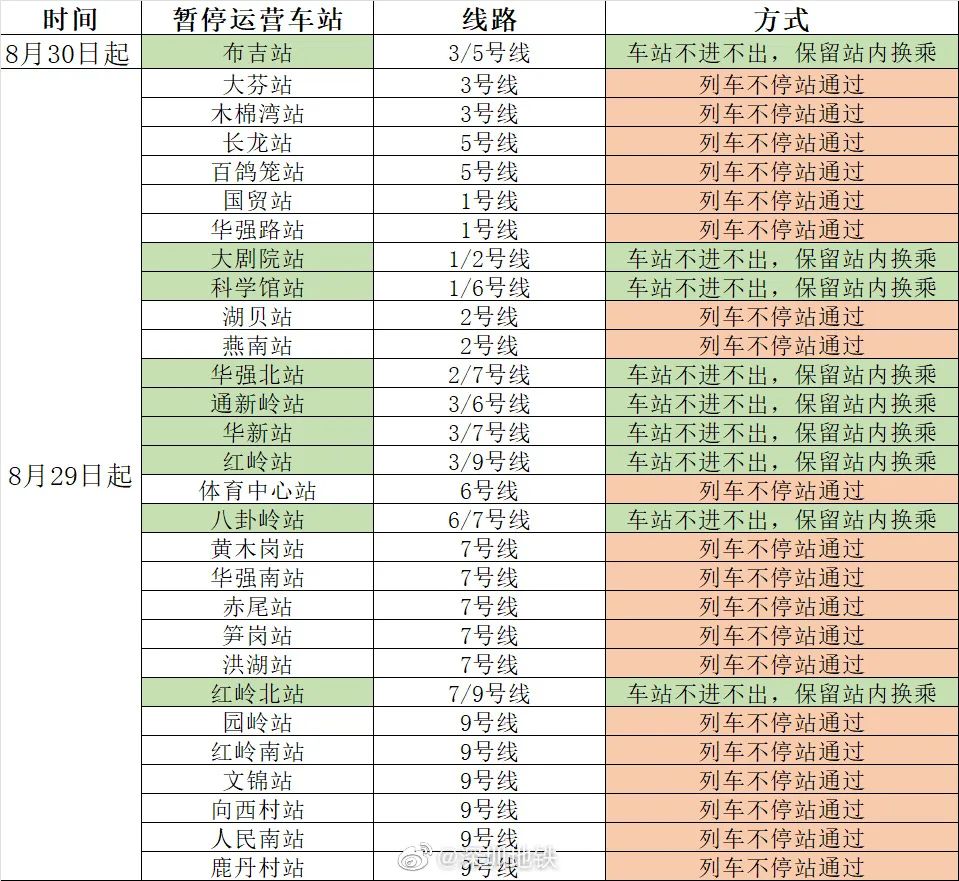 8月30日,深圳地铁发布运营公告,根据新冠疫情防控需要,自8月30日12:00起,深圳地铁3/5号线布吉站暂停运营服务,具体恢复时间待另行通知。深圳地铁停运车站增至29个,所有停运车站关闭出入口,人员不进不出。