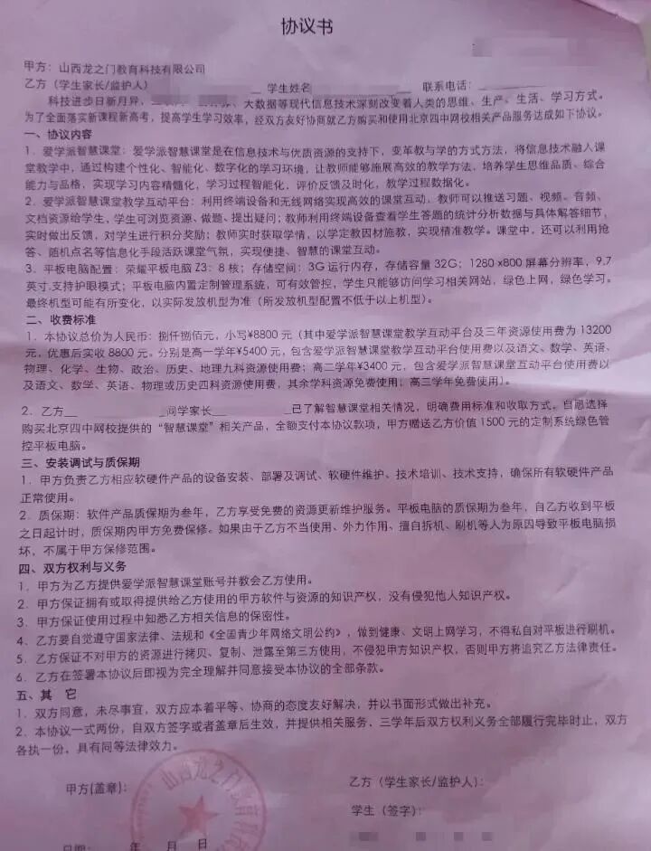 家长与山西龙之门教育科技有限公司签署的协议。国务院第九次大督查第一督查组供图