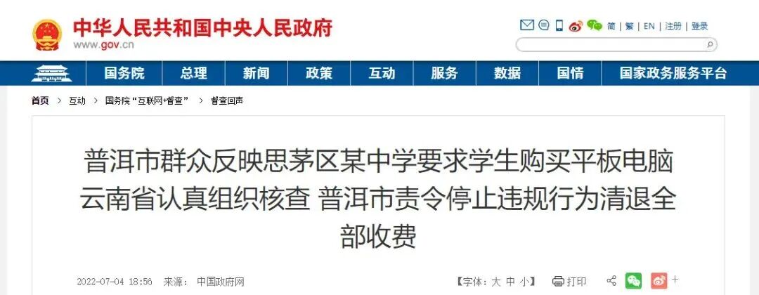 普洱市有关部门已责令该校立即停止违规收费行为,取消智慧班与普通班分班,督促该校向719名学生退还了全部违规收费244.46万元,并将平板电脑、配套设备及教学资源收回供统一教学使用。
