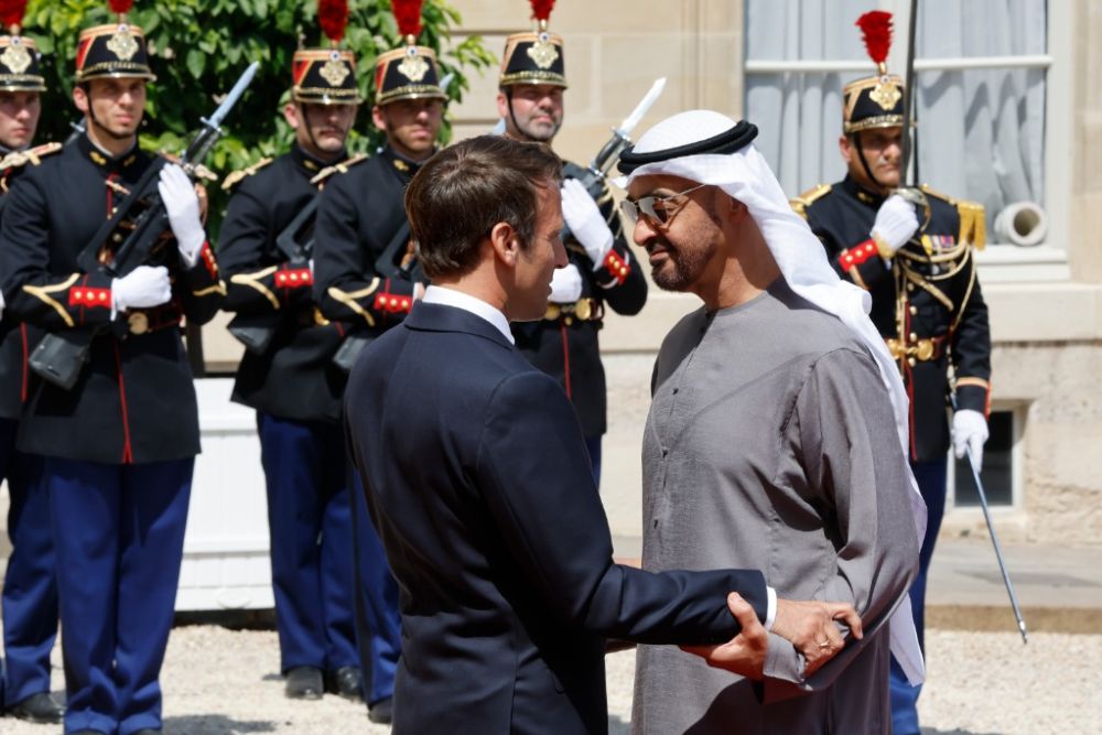 7月18日,法国总统马克龙(前排左)在巴黎总统府爱丽舍宫迎接到访的阿拉伯联合酋长国总统穆罕默德。两国总统在当天的会见中着重讨论了能源领域合作。新华社发(里特·艾斯摄)