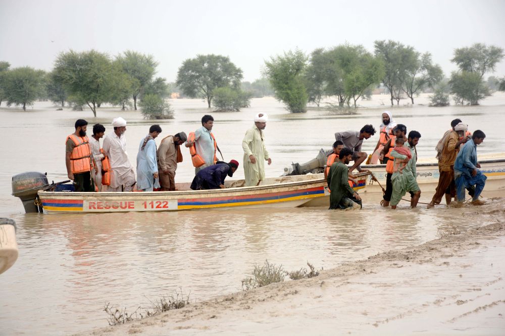 8月27日,在巴基斯坦拉金布尔,救援人员帮助受灾民众撤离。新华社发(曼苏尔 摄)