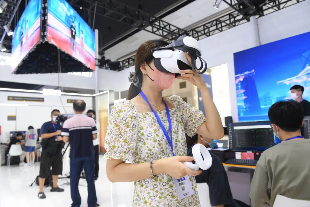 观众在湖南广播影视集团展区体验VR。湖南日报记者 辜鹏博摄
