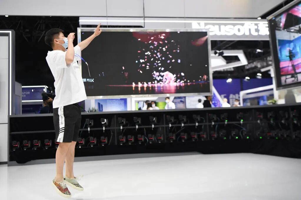 走进2022中国新媒体技术展,各式各样的新科技让人目不暇接。在湖南广播影视集团有限公司展区,观众可以体验平时在晚会、体育赛事等才得一见的特效:广播级超高清(4K)时空凝结自由视角互动系统捕捉下的观众动作画面,经过算法处理,成像画面能够全角度旋转,面部表情、身姿形态等一览无遗。