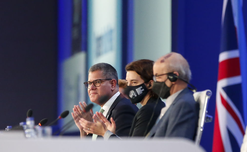 2021年11月13日,《联合国气候变化框架公约》第26次缔约方大会主席夏尔马(左)出席在英国格拉斯哥举行的闭幕会。新华社记者 韩岩 摄