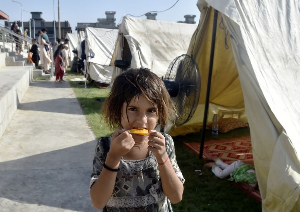 8月31日,在巴基斯坦西北部开伯尔-普什图省的贾尔瑟达地区,一名小女孩在救灾帐篷外吃东西。新华社发(赛义德·艾哈迈德 摄)