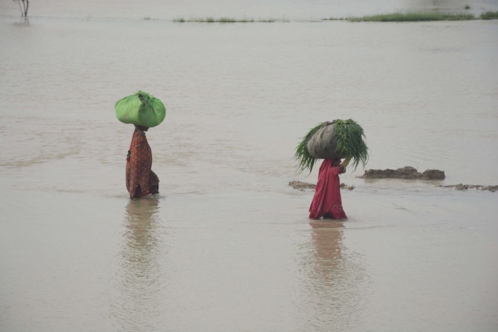 在地势高于两旁被水淹没田地的主要道路上,逃难民众带着随身财物和牲畜,用塑料布搭起简易帐篷,躲避大雨或者下雨间歇毒辣的太阳。