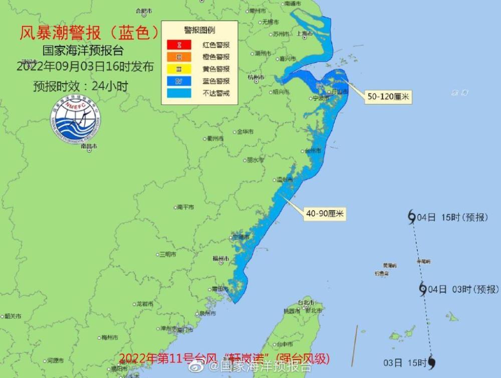 国家海洋预报台3日16时发布风暴潮蓝色警报:预计9月3日下午到4日下午,长江口至杭州湾沿海将出现50到120厘米的风暴增水,浙江台州至福建福州沿海将出现40到90厘米的风暴增水。浙江省宁波市和舟山市的风暴潮预警级别为蓝色。