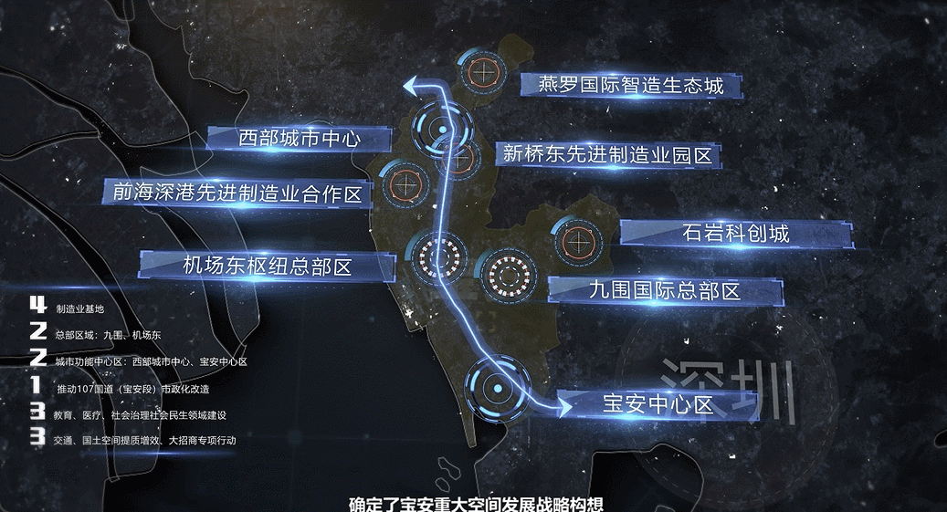 宝安区近期发布精准对接粤港澳大湾区建设和打造黄金内湾战略的空间规划蓝图,公布了机场东商务总部区、九围国际总部区、燕罗国际智能制造生态城、石岩科创城、深港先进制造业合作区、深圳西部城市中心等片区规划,拉开了宝安立足湾区的空间战略架构。