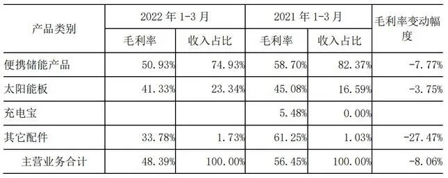 记者分析财报发现,公司净利润的高速增长,与其超高的毛利率有着不可分割的关系。财报显示,2021年第一季度,华宝新能最核心的便携储能产品,其毛利率达到58.7%!虽然2022年第一季度有所下降,但毛利率仍然高于50%。