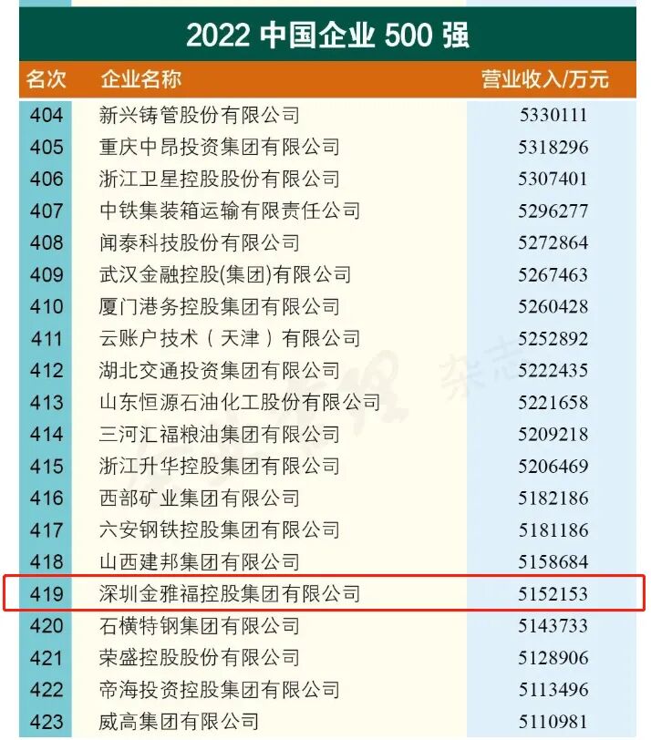 9月6日上午,中国企业联合会、中国企业家协会(简称中国企联)在京举办新闻发布会,向社会正式发布“2022中国企业500强”、“2022中国服务业企业500强”等榜单。金雅福集团以515.2亿元的营业收入荣登2022中国企业500强第419位,较上一年度提升54位,营业收入较上一年度增加105亿元;同时,金雅福集团入选2022中国企业服务业500强榜单,位居第149位,较上一年度提升20位。本次入选,是金雅福集团连续4年荣登“中国企业500强”的榜单。