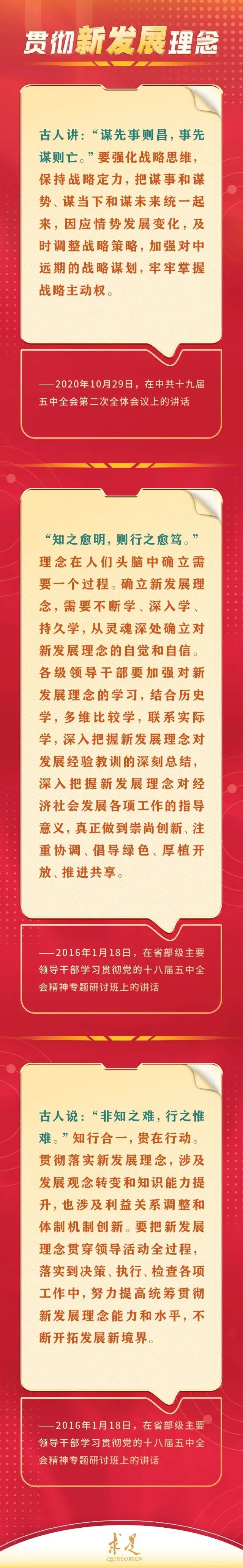 编者按:8月16日出版的第16期《求是》杂志刊发习近平总书记重要文章《全党必须完整、准确、全面贯彻新发展理念》,从“扎扎实实贯彻新发展理念”、“落实以人民为中心的发展思想”、“继续深化改革开放”、“坚持系统观念”、“善于从政治上看问题”五个方面,对完整、准确、全面贯彻新发展理念作出深刻论述、提出明确要求。党的十八大以来,习近平总书记围绕完整、准确、全面贯彻新发展理念发表一系列重要论述,在论述中精妙运用古代典籍、经典名句,以古喻今、启迪思想、激荡精神。一起来学习!