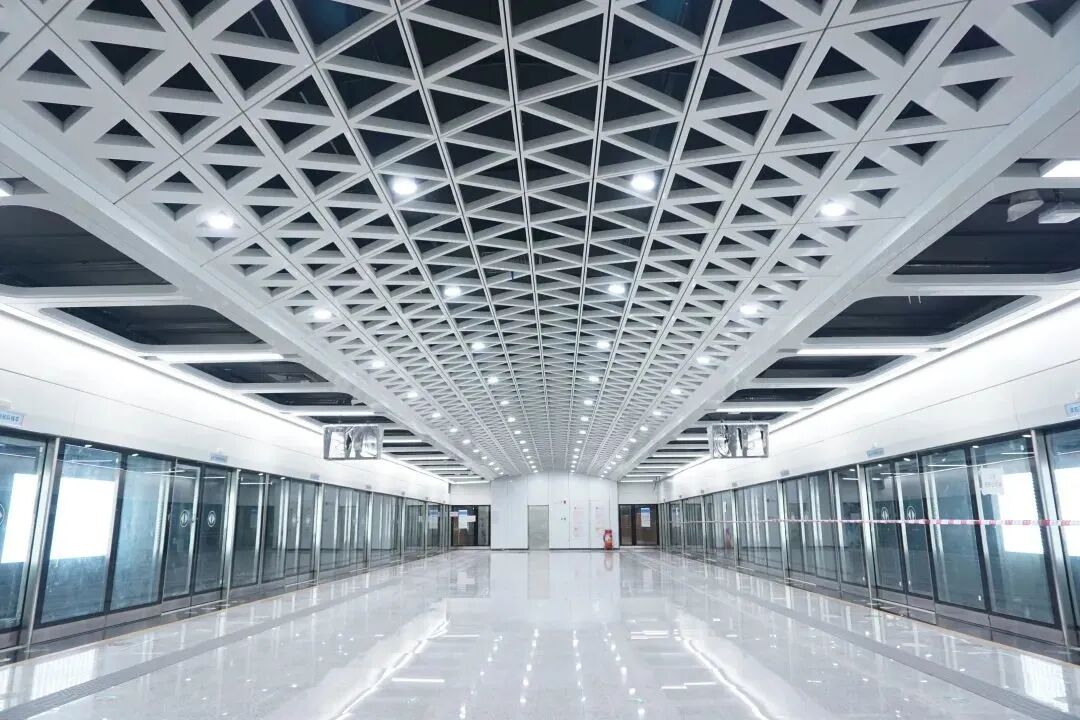 大运中心站采用虚实设计手法,天花板以白色三角造型,有序地渐变过渡至墙面,使空间造型更具立体感。