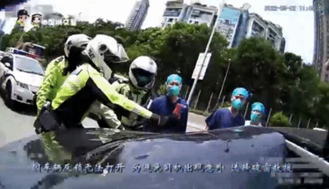 “咚咚咚!”车流滚滚中,在深圳北环香梅立交附近,一辆黑色小车旁,交警正在不停地敲打着车窗,车内的司机看起来已经昏迷不醒了,此时医护人员也已赶到。紧急之下,交警铁骑最后果断破窗而入,将司机救出了车子。