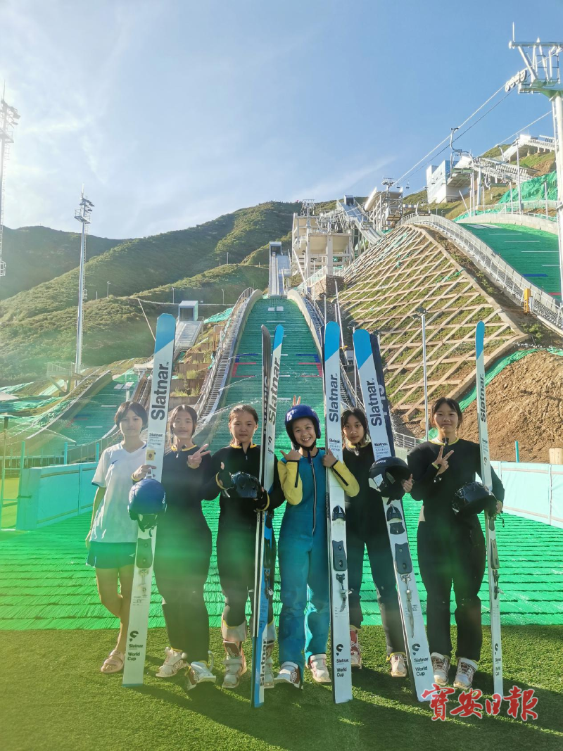 蔡昕娜(前排右一)与教练、队友在陆地跳台前合影。