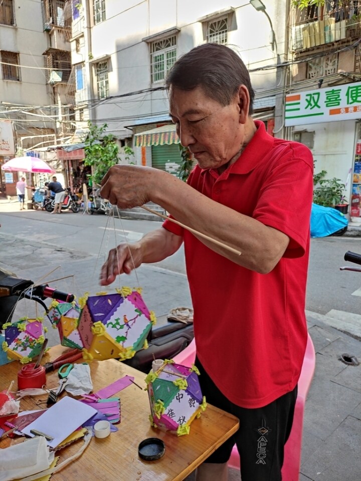 中秋节,金风送爽,惠城区桥东街道下塘街12号一家小店门前,古稀之年的林志武老人心无旁骛地制作传统灯笼。一旁的水东街车水马龙,一个埋首手工劳动的老人和头顶形式多样的彩灯,这样的画面,已历10年,成为桥东老街中秋节的一道亮丽风景线。