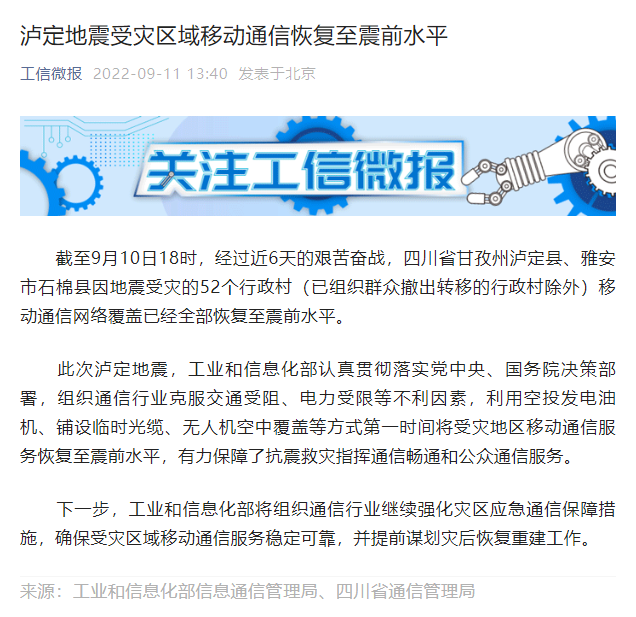 此次泸定地震,工业和信息化部认真贯彻落实党中央、国务院决策部署,组织通信行业克服交通受阻、电力受限等不利因素,利用空投发电油机、铺设临时光缆、无人机空中覆盖等方式第一时间将受灾地区移动通信服务恢复至震前水平,有力保障了抗震救灾指挥通信畅通和公众通信服务。