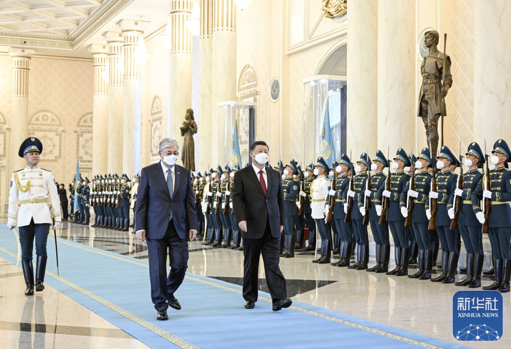 托卡耶夫为习近平举行隆重欢迎仪式。两国元首共同登上检阅台,军乐团奏中哈两国国歌。习近平在托卡耶夫陪同下检阅仪仗队。