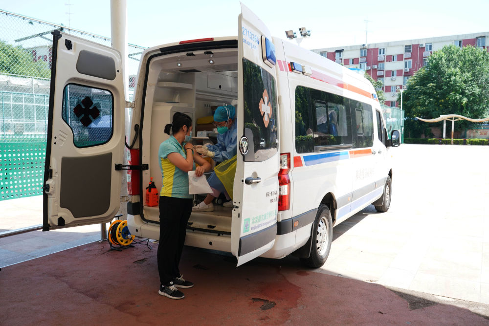 2022年7月13日,在北京市海淀区北下关街道中国农业科学院社区新冠疫苗临时接种点,医护人员在流动疫苗接种车上为社区居民接种。新华社记者 任超 摄
