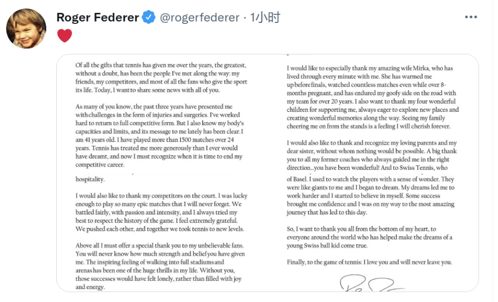 这是费德勒15日在个人社交媒体上发布的告别信。