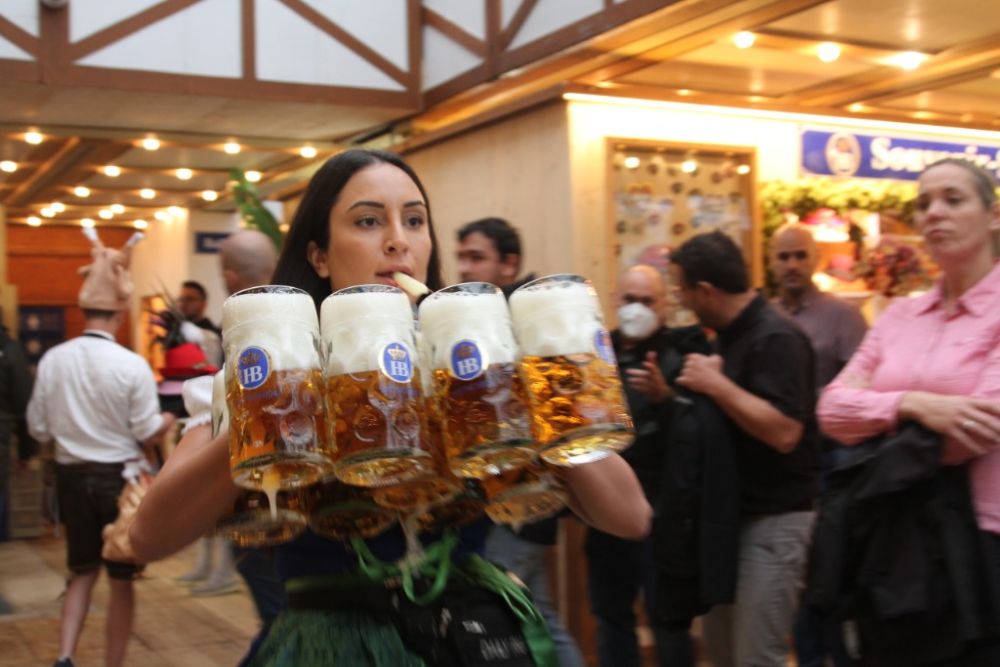 9月17日,在德国慕尼黑啤酒节上,一名工作人员为顾客送啤酒。(新华社记者单玮怡摄)