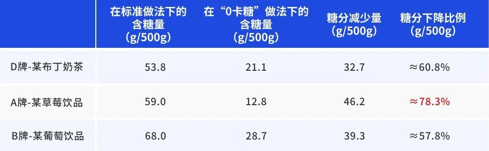 尤其,在A牌-某草莓饮品中,“0卡糖”比全糖减少46.2克的糖,降低近八成。