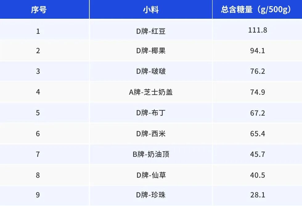 在500克的D牌-红豆中,就含糖111.8克。即便是含糖量最少的D牌-珍珠,在500克中,也有28.1克的糖。