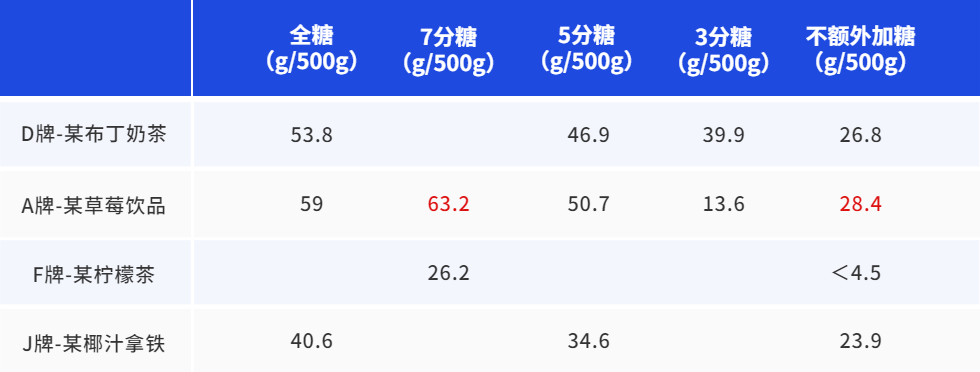 但是,也有个别饮品出现反常,可能存在“手抖”的情况。有的7分糖的含糖量高于全糖,有的不额外加糖的含糖量高于3分糖。