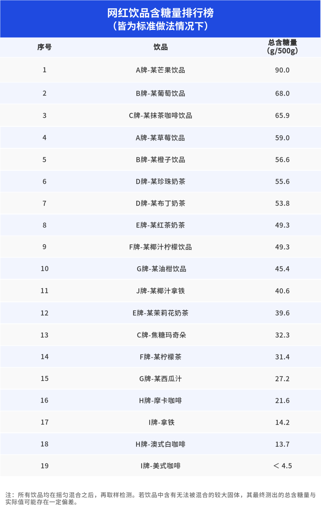 但由于检测的部分饮品中,含有水果,无法区分添加糖和来自水果的果糖。所以,本次饮品检测出的含糖量仅供参考。