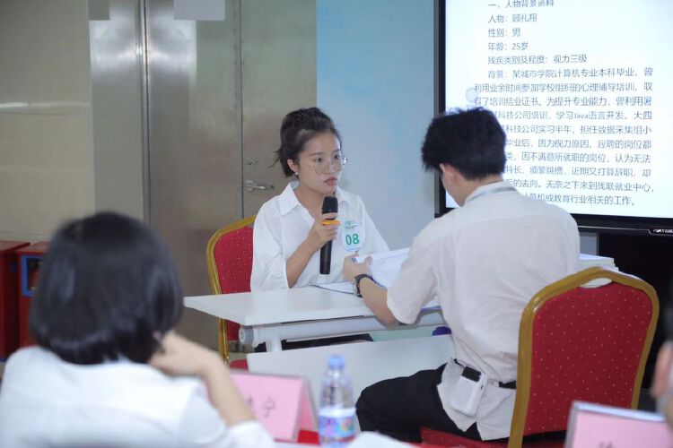 竞赛中选手通过自我陈述环节,剖析、分享个人在职业指导、就业服务及残疾人服务工作中的典型个案,分享服务经验,交流业务理论的运用;通过工作场景情景模拟环节,路演模拟了残疾人就业服务机构、培训机构的日常业务工作,并就试题中残疾人、用人单位所寻求解决的突出问题进行了分析与调解,充分展现其综合职业素养和服务能力。
