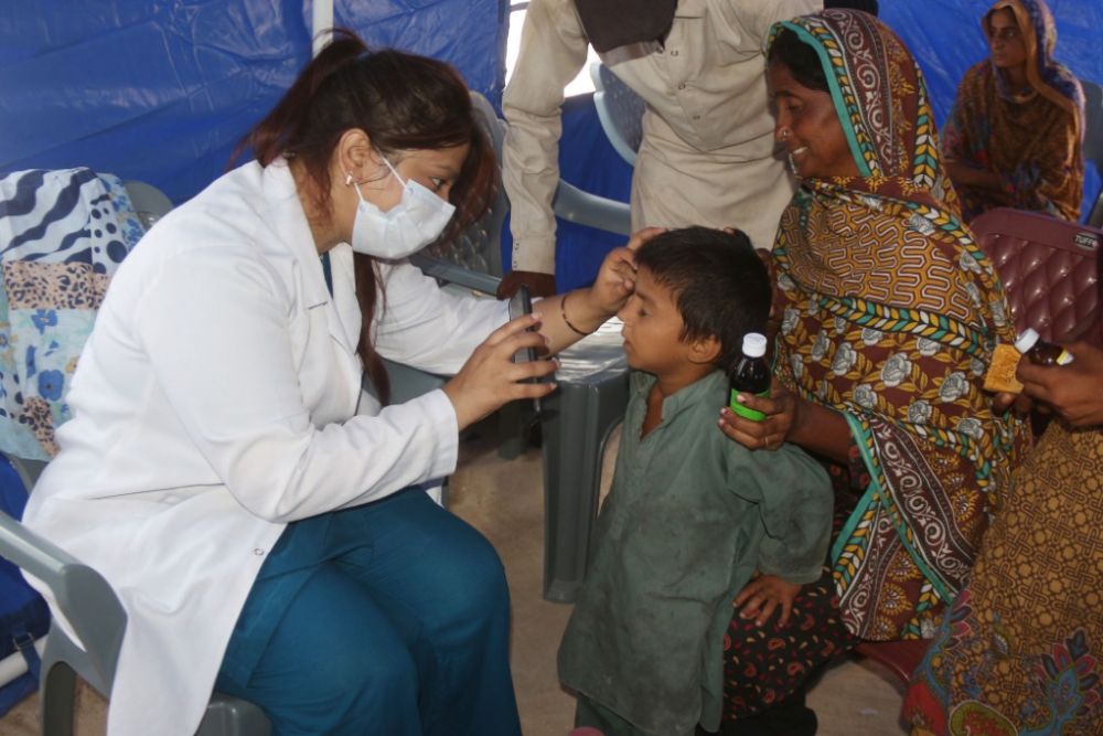 9月4日,医生在巴基斯坦海得拉巴的一处帐篷营地为受到洪灾影响的儿童检查身体。新华社发