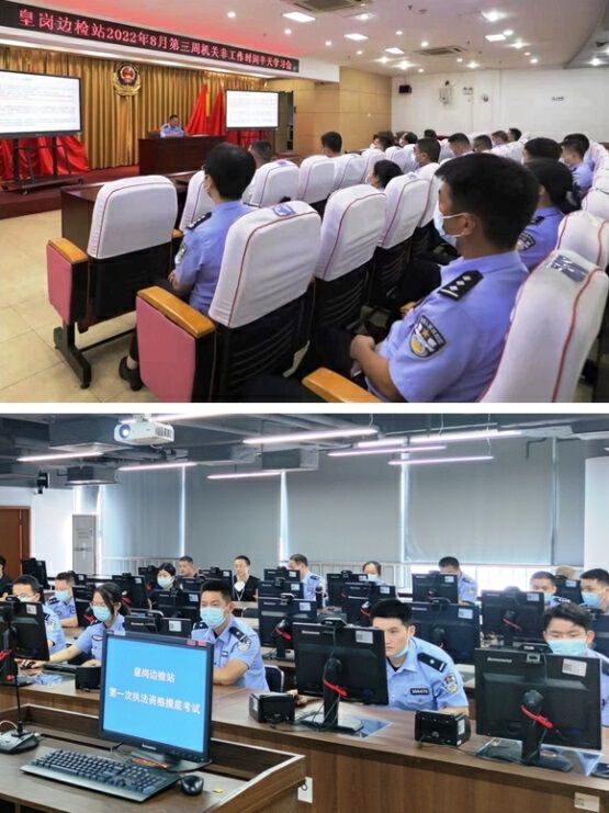 ▲皇岗边检站机关非工作时间半天学习会与组织民警进行执法资格模底考试。