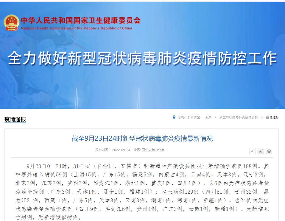 9月23日0—24时,31个省(自治区、直辖市)和新疆生产建设兵团报告新增确诊病例188例。其中境外输入病例59例(上海15例,广东15例,福建5例,内蒙古4例,云南4例,天津3例,辽宁3例,北京2例,江苏2例,陕西2例,黑龙江1例,湖北1例,重庆1例,四川1例),含6例由无症状感染者转为确诊病例(广东3例,天津1例,辽宁1例,福建1例);本土病例129例(四川51例,贵州32例,黑龙江21例,西藏11例,广东5例,天津3例,云南3例,湖南1例,海南1例,新疆1例),含24例由无症状感染者转为确诊病例(四川9例,黑龙江6例,贵州4例,广东3例,云南1例,新疆1例)。无新增死亡病例。无新增疑似病例。