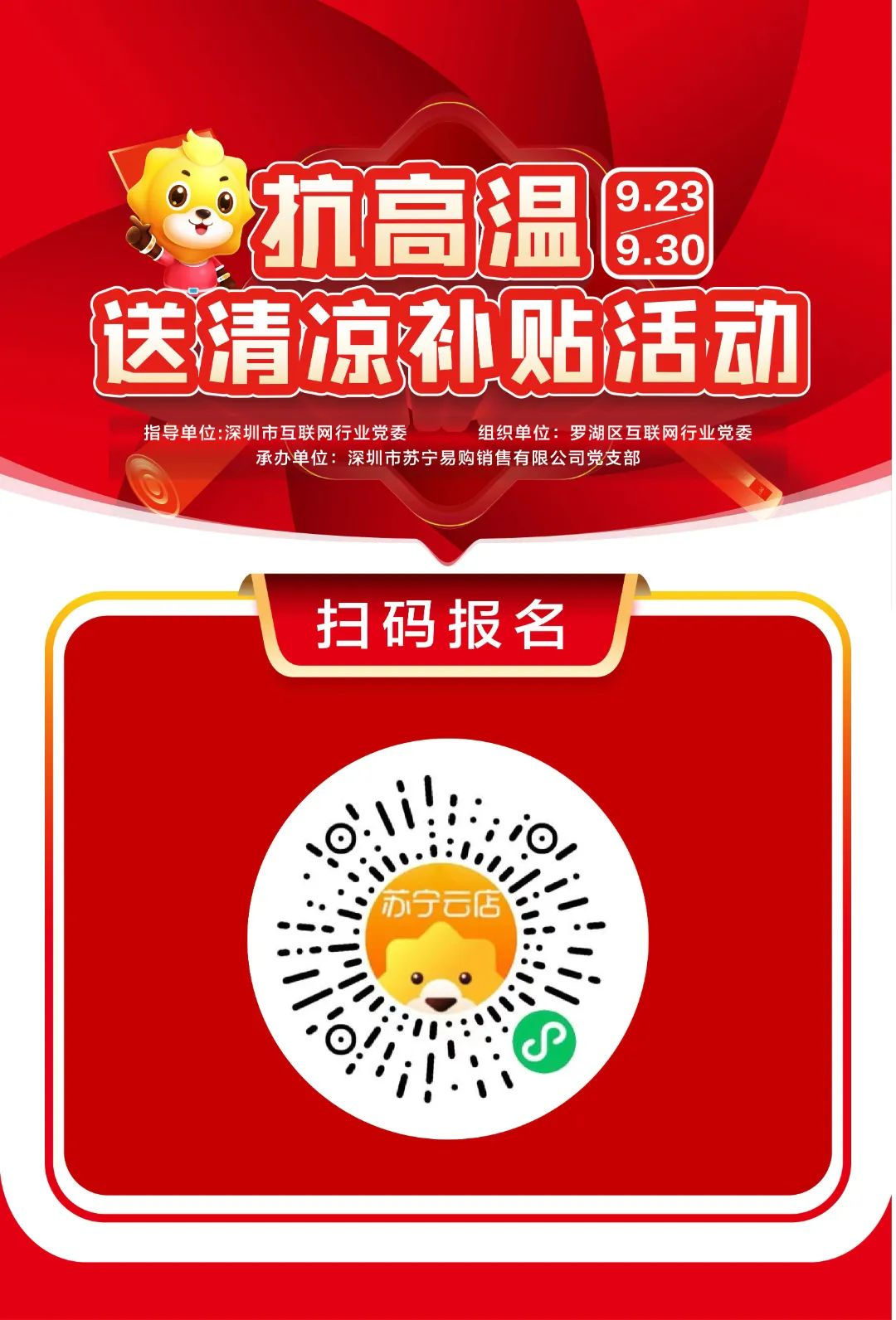 日前,罗湖区互联网行业党委携手深圳市苏宁易购销售有限公司党支部开展“抗高温,送清凉”电器专场补贴活动,为新业态新就业群体中的外卖骑手及网约车司机提供专项补贴,补贴时间为9月23日至9月30日。