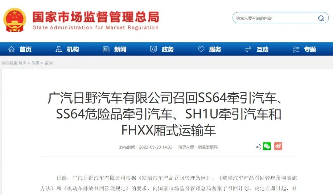 广汽日野汽车有限公司召回SS64牵引汽车、SS64危险品牵引汽车、SH1U牵引汽车和FHXX厢式运输车