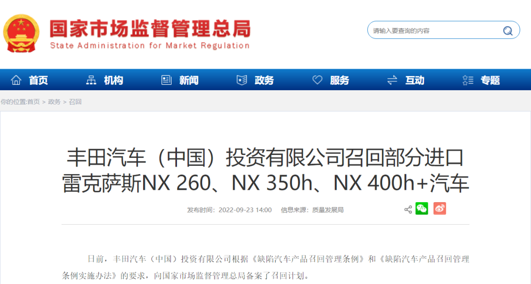 一、自2022年9月28日起,召回生产日期在2021年3月31日至2022年4月26日期间的部分进口雷克萨斯NX 260、NX 350h、NX 400h+汽车,共计8308台。