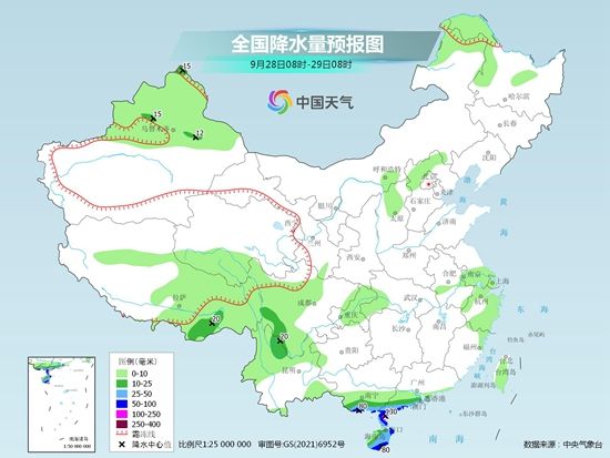 受其影响,今天广东西南部沿海、海南岛大部、西沙群岛、中沙群岛将有大到暴雨,其中海南岛东部、西沙群岛有大暴雨,西沙群岛附近海域局地有特大暴雨。除此之外,华西秋雨依然在进行中。今天,强降雨区将向东、向南转移;明天,本轮降雨会明显收敛。