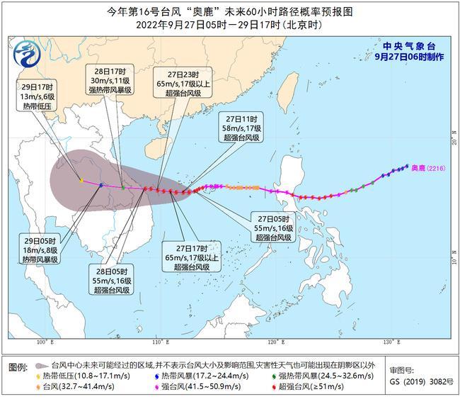 今天早晨6时,台风“奥鹿”中心位于海南省三沙市(西沙永兴岛)南偏东方向大约145公里的海面上,预计,“奥鹿”将以每小时20公里左右的速度向偏西方向移动,强度还将有所增强,掠过西沙群岛南部海域后,将于28日早晨在越南中部沿海登陆,登陆后强度逐渐减弱。中央气象台继续发布台风黄色预警。