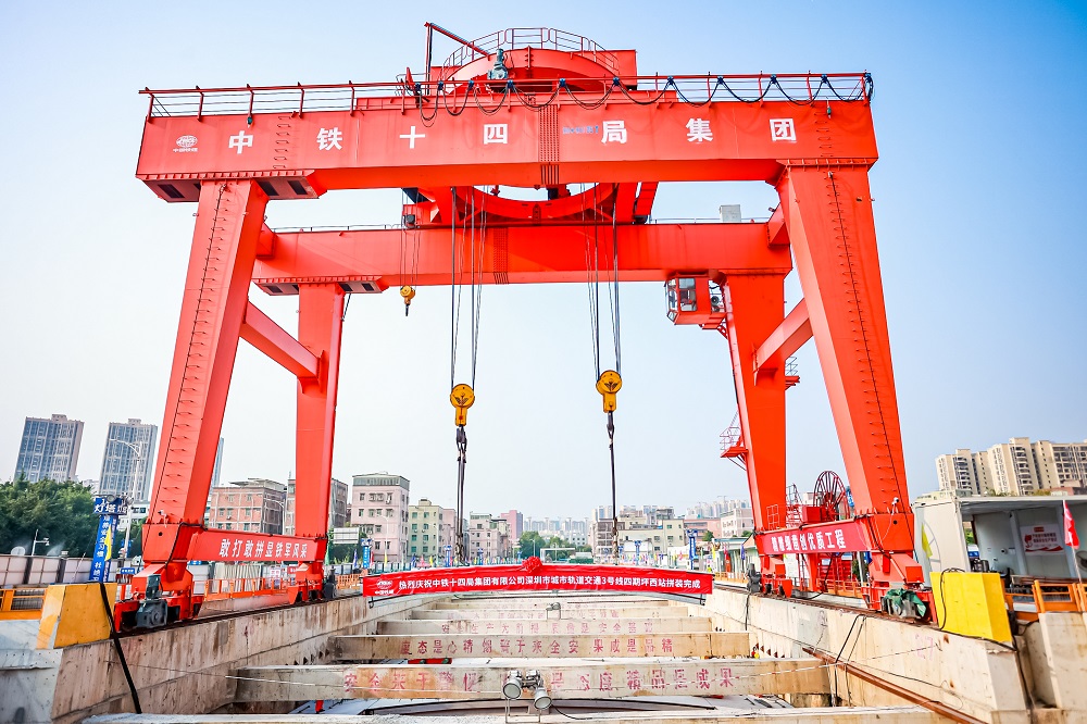 深晚记者在现场获悉,为快速、高效、安全完成拼装施工,深圳地铁联合施工单位研制了可实现360度旋转具有防摇摆装置的180吨双钩龙门吊、分离式专项新型拼装台车,在坪西站首创3个作业面阶梯分布、3台拼装台车同步施工模式,保证了拼装施工的高效。