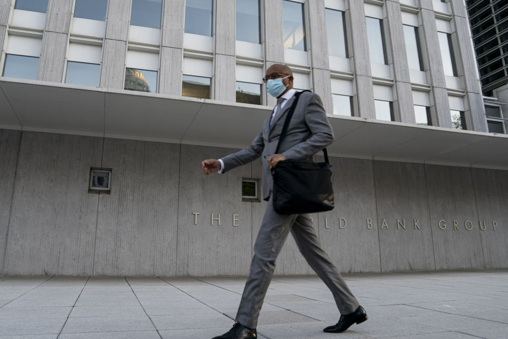 4月20日,在美国华盛顿,行人从世界银行总部前走过。(新华社记者 刘杰摄)