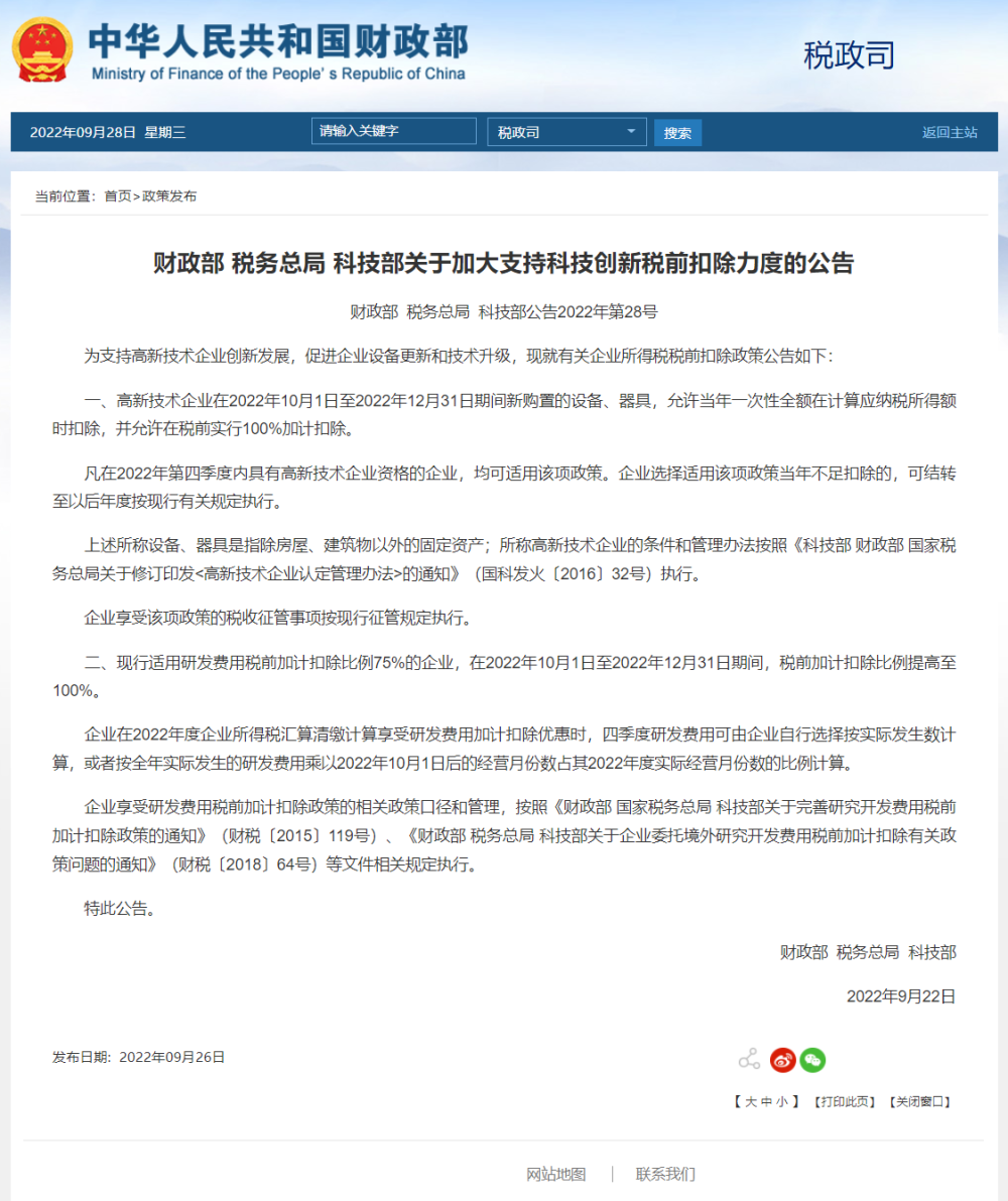二、现行适用研发费用税前加计扣除比例75%的企业,在2022年10月1日至2022年12月31日期间,税前加计扣除比例提高至100%。