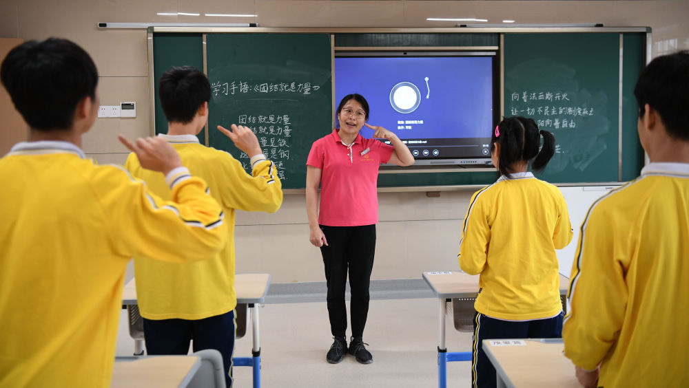 广东茂名市社会福利中心工作人员曾传莹(中)在给孩子上手语课(2021年4月27日摄)。新华社记者 邓华 摄