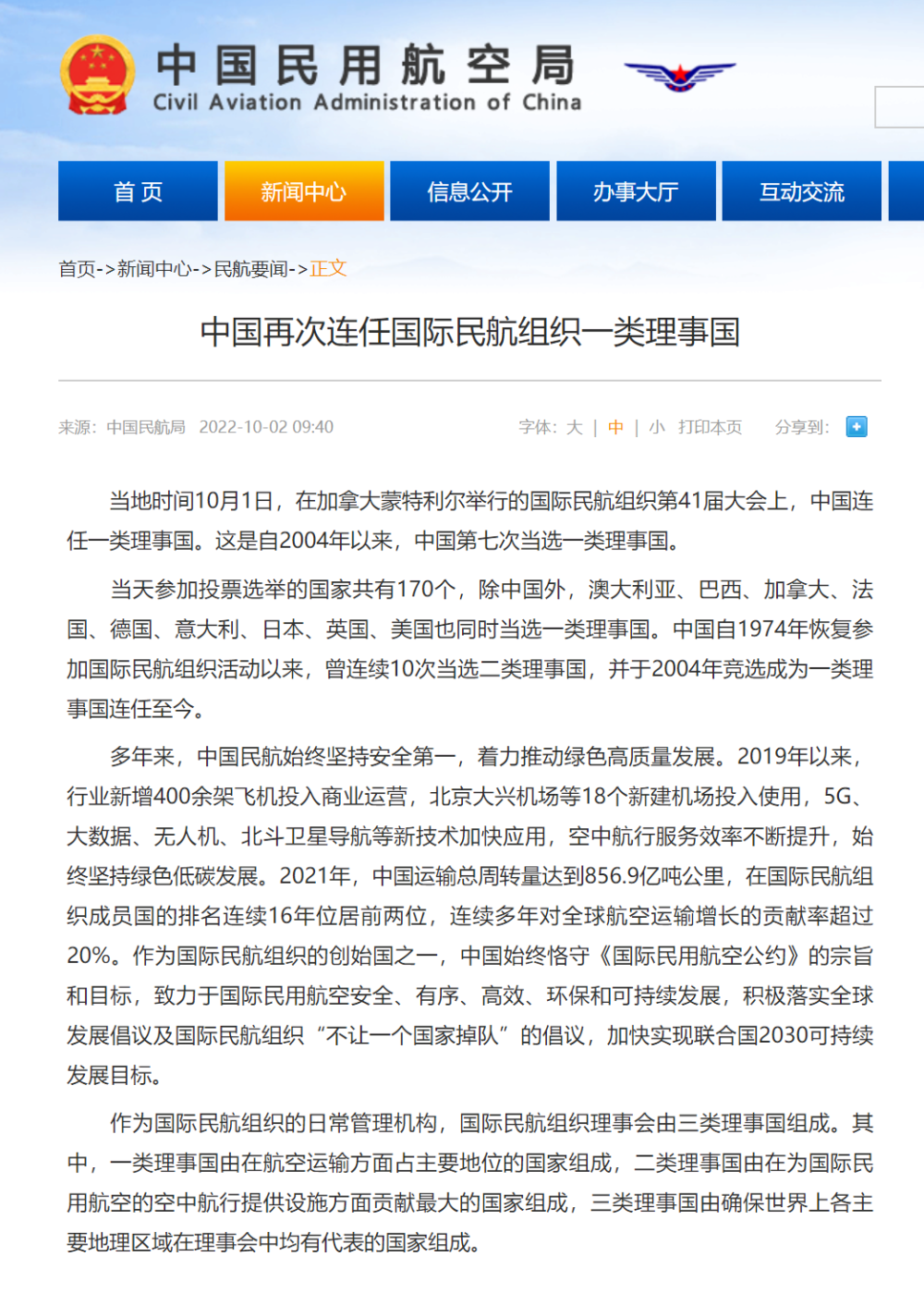 (原标题《中国民航局:中国再次连任国际民航组织一类理事国》)