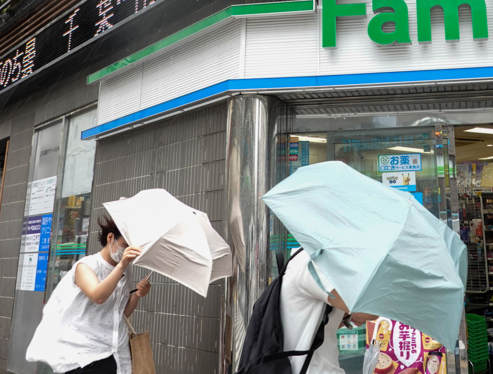 9月19日,行人在日本东京街头冒雨前行。新华社记者 张笑宇 摄